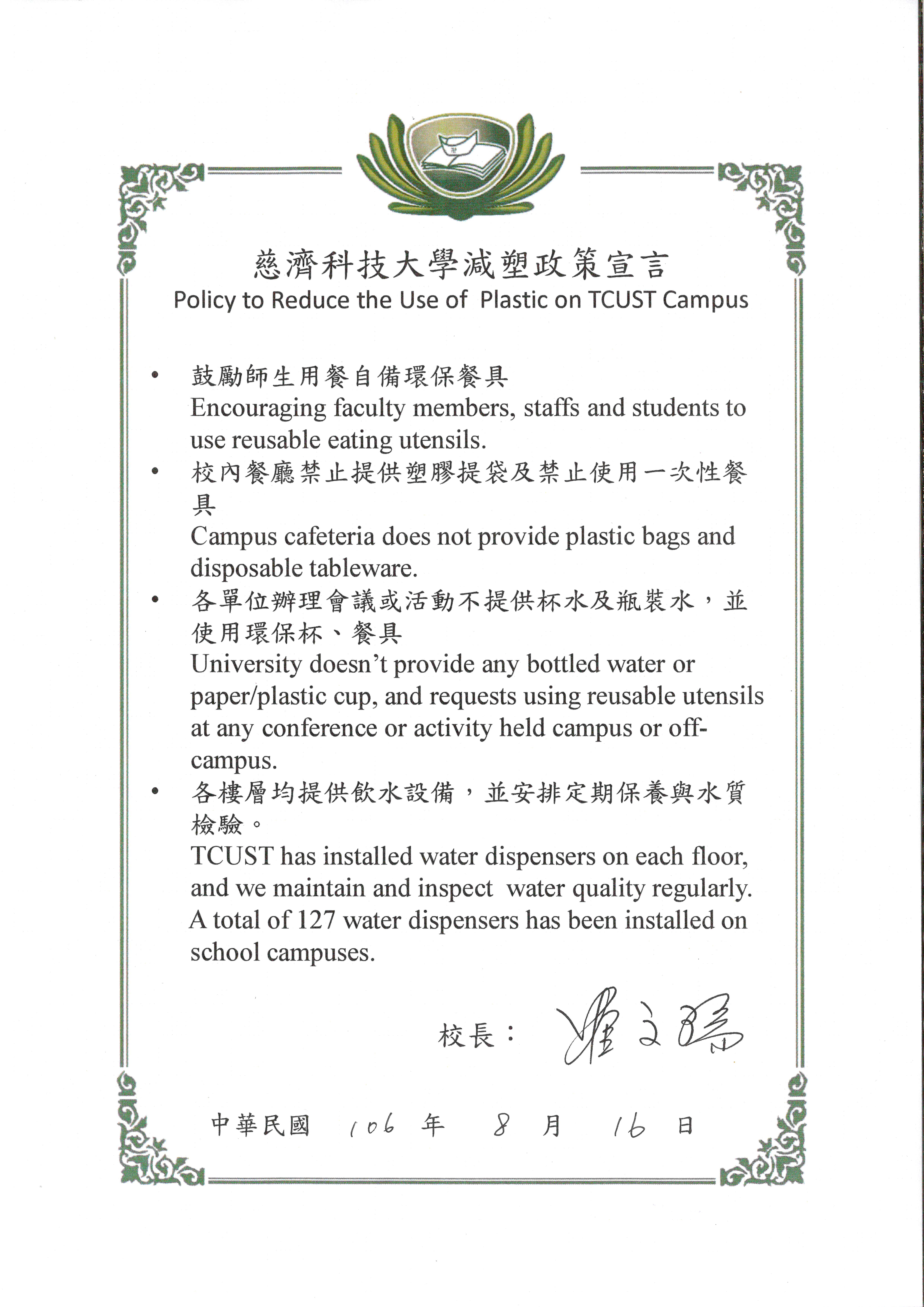 慈濟科大減塑政策宣言
